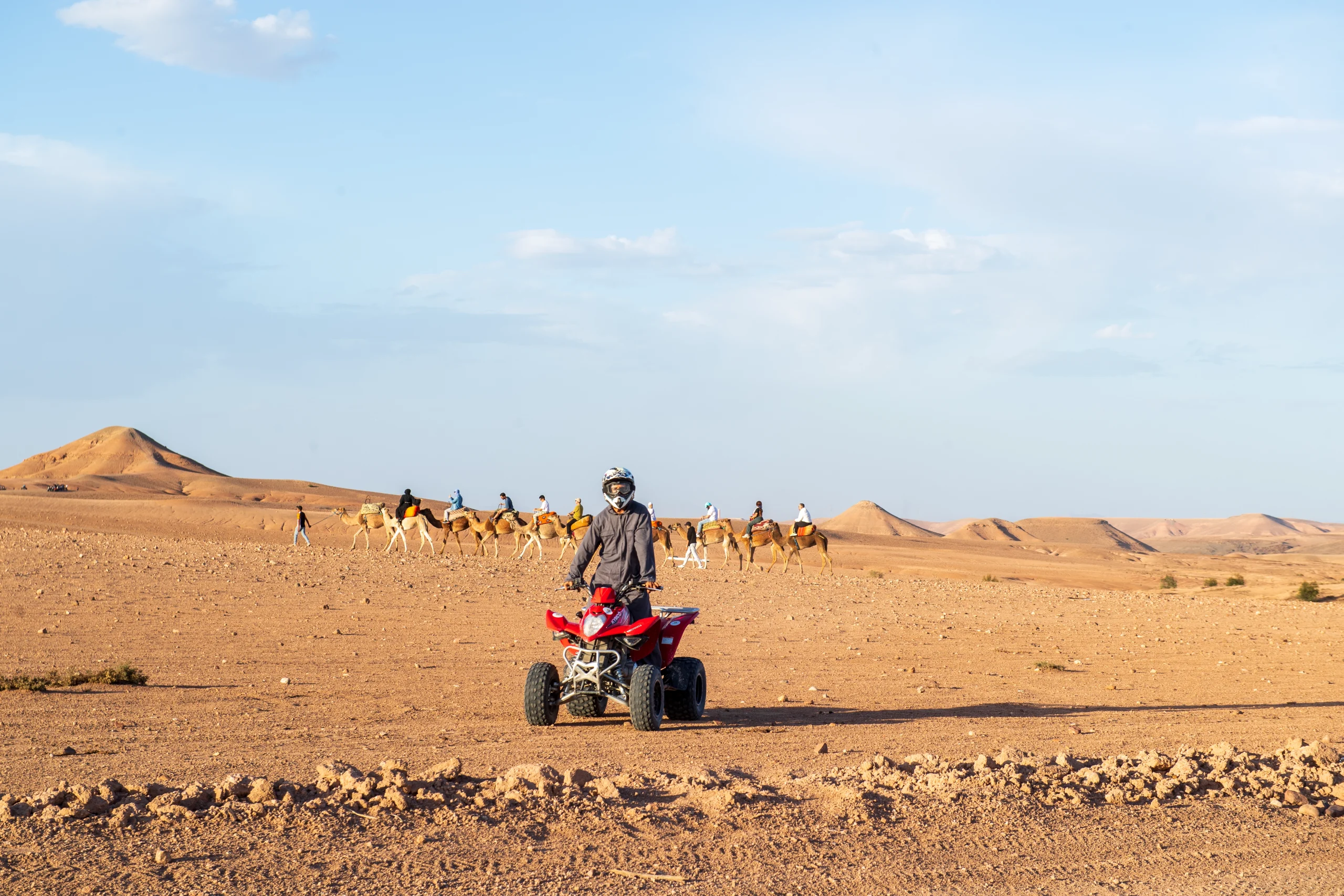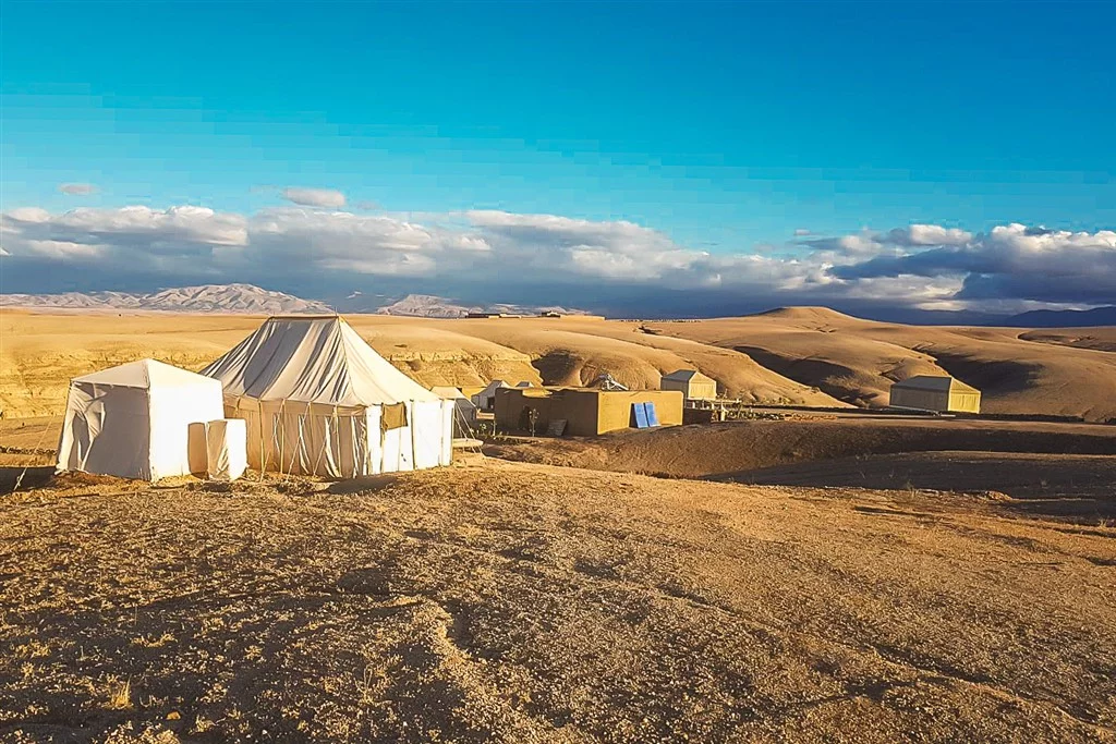 Agafay desert day trip will take you to A very exotic and magical place where you will lose track of time. It is difficult to imagine anything more inspiring than an Agafay luxury desert camp with all the comforts, camped in a vast stone desert with an almost lunar aspect, with the tents, against a backdrop of the impressive snow-capped Atlas Mountains.